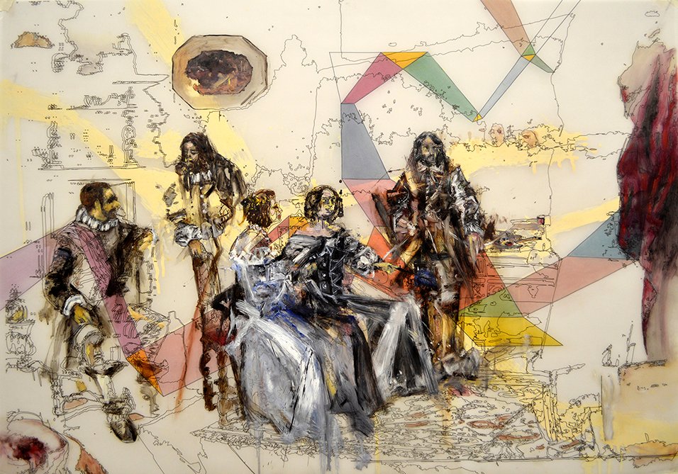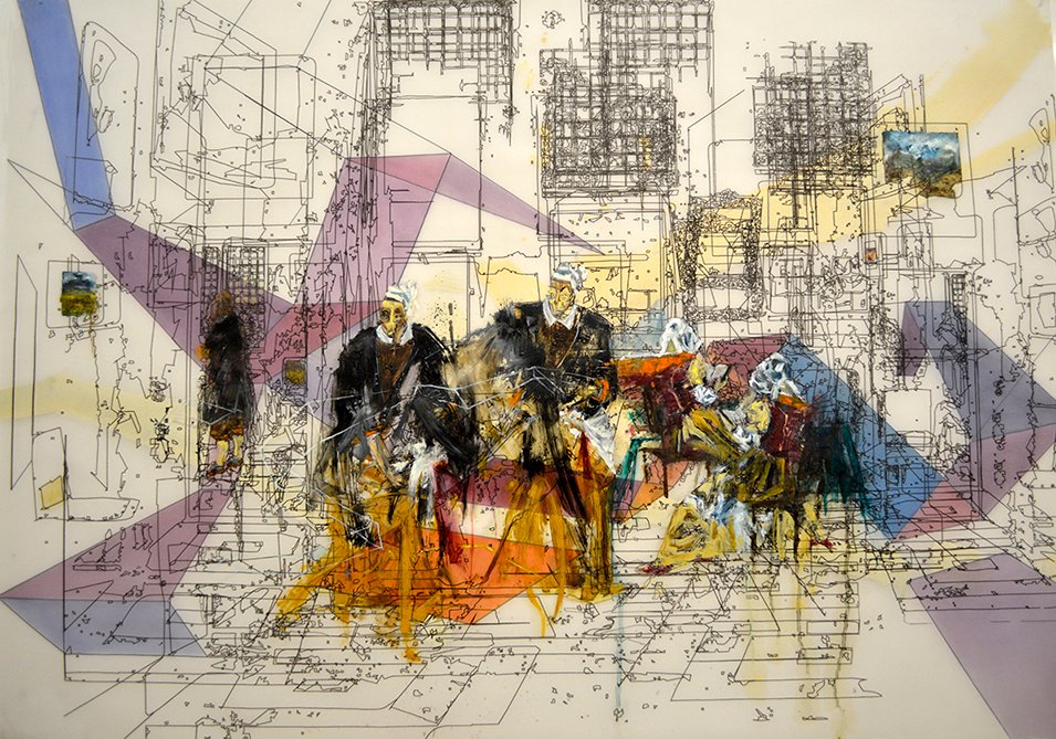 “Interior with Painter, Woman reading and Maid sweeping Nº 2 ” / Mixed Media on translucent paper / 70 x 100 cm / .