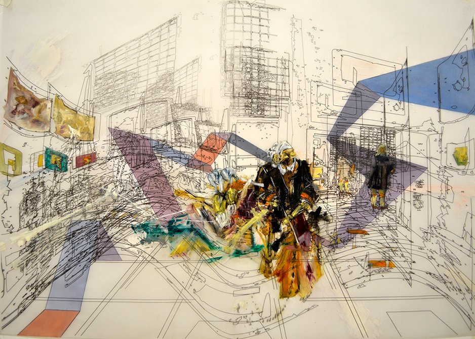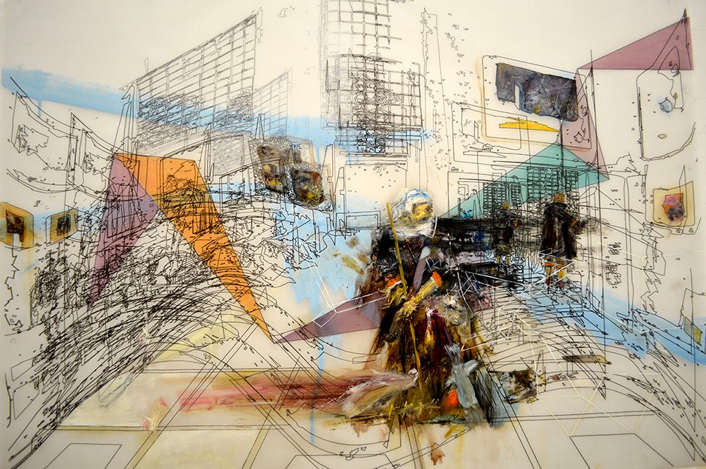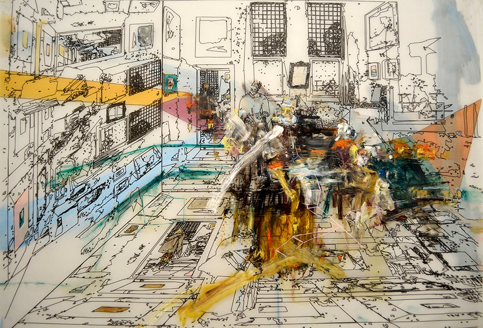 ” Scène d’intérieur ” / Mixed media on translucent paper / 100 X 70 cm /